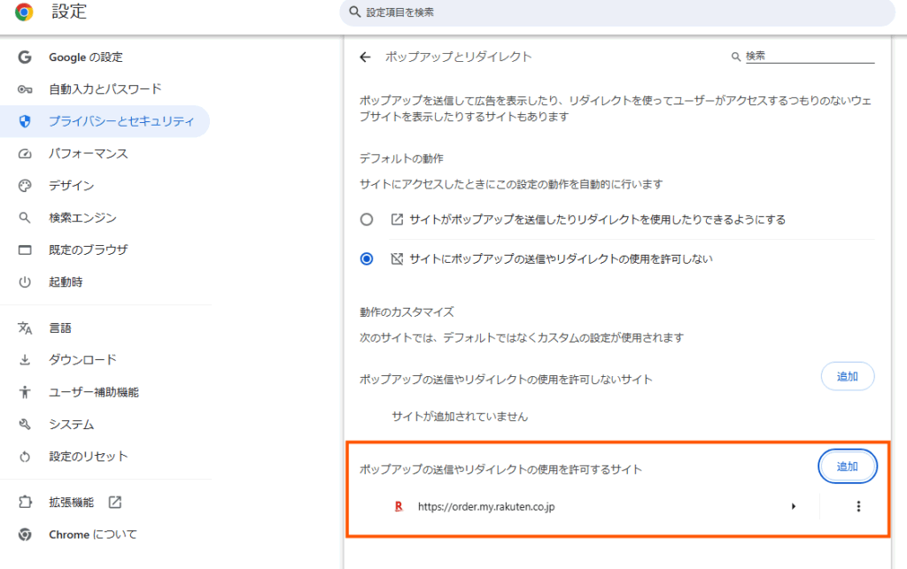 楽天でご利用する場合、Chromeの設定で「ポップアップとリダイレクトの許可サイト」に