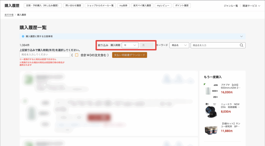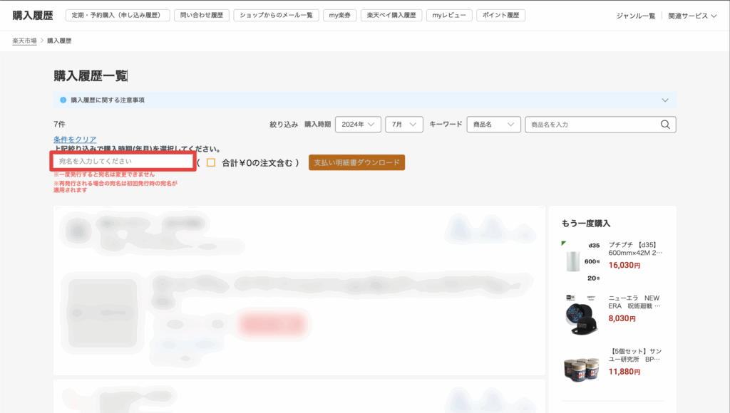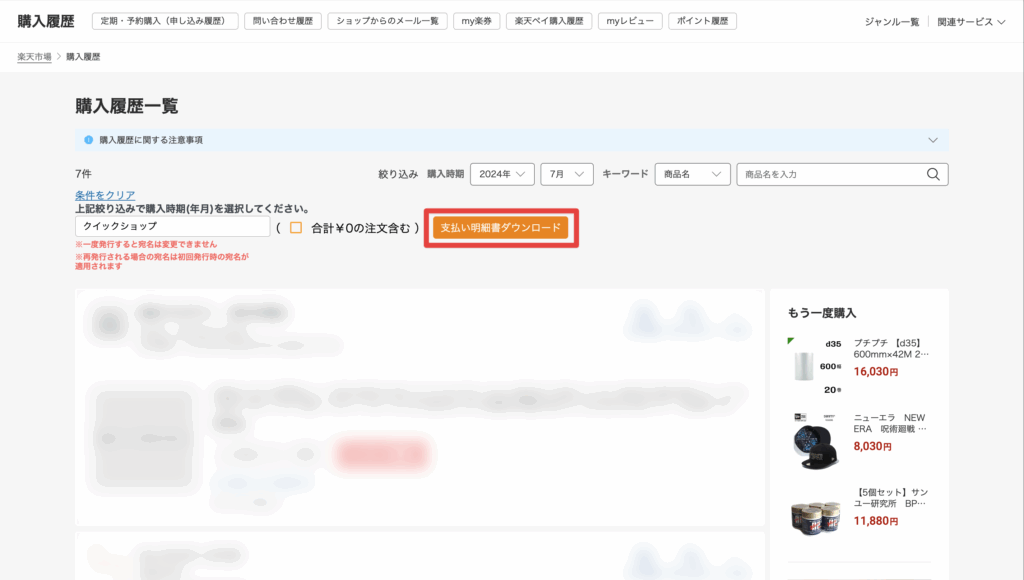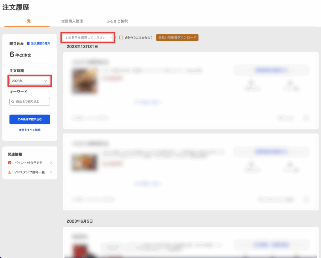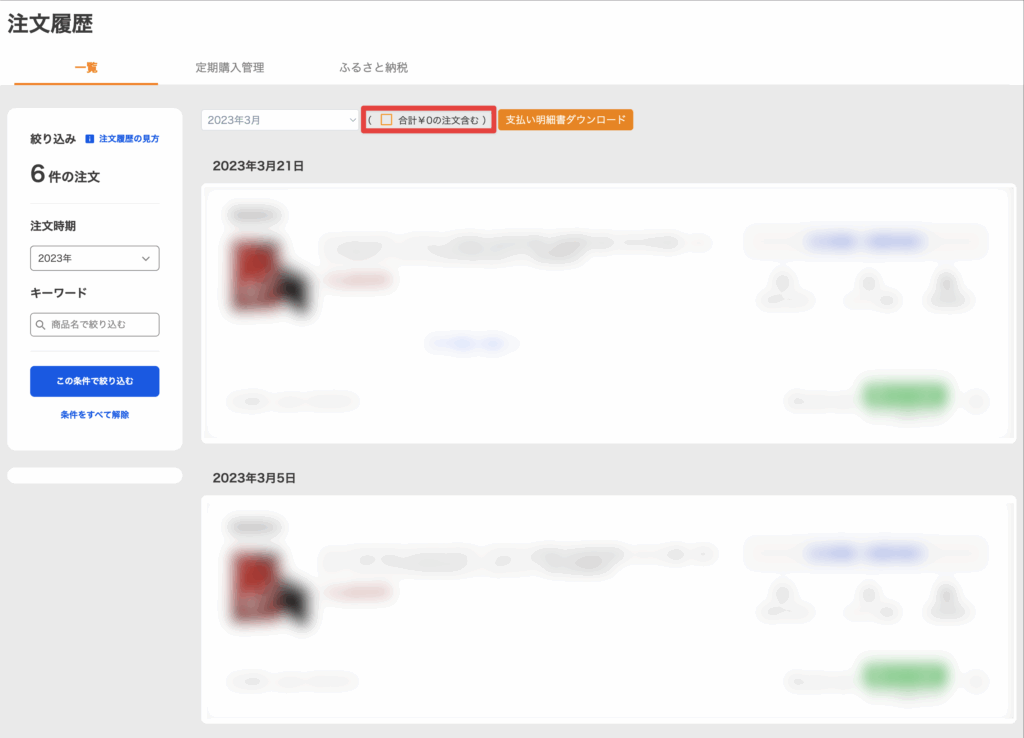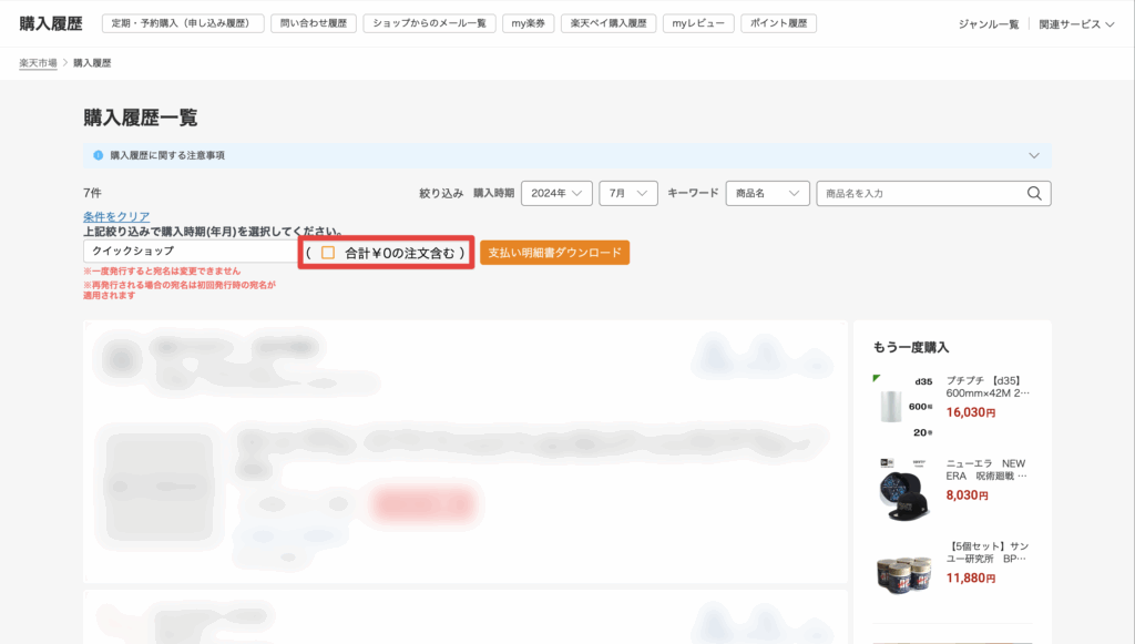 • 合計¥0の注文を含む: 商品購入代金を全額ポイントで支払った注文の明細書が必要な場合にチェックを入れます。