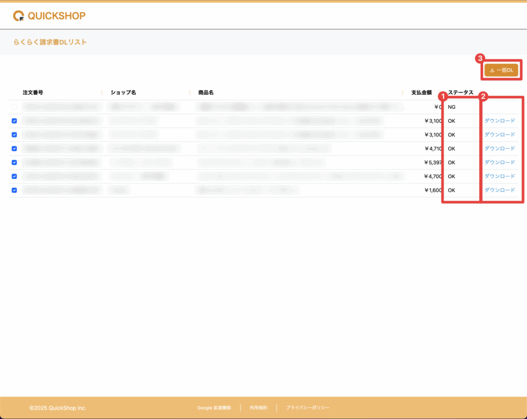 ① ステータスには対象注文履歴の明細書のダウンロード可否が記載されています。