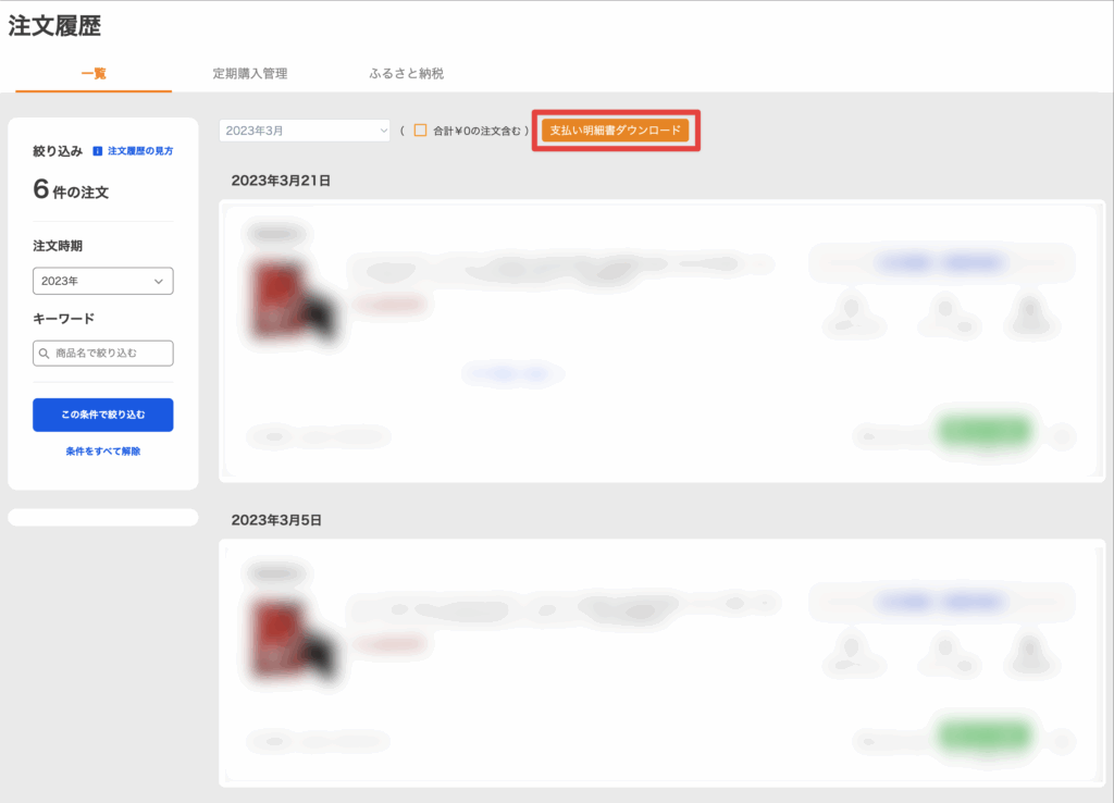 • デジタルを含む: KindleやPrime Videoなどのデジタル商品の明細書が必要な場合にチェックを入れます。