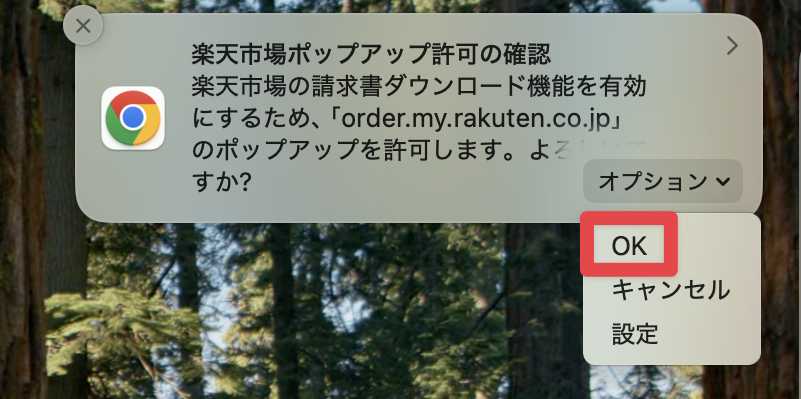 「楽天市場ポップアップ許可の確認」が表示されますので、「OK」を選択してしていただくことで
